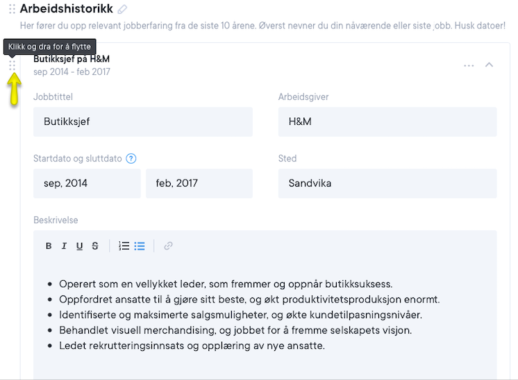 Redigere tittelen til avsnittene - Nå er det også mulig å endre titlene til de forskjellige avsnittene, og dermed skreddersy CV-en din enda mer etter dine ønsker og behov.