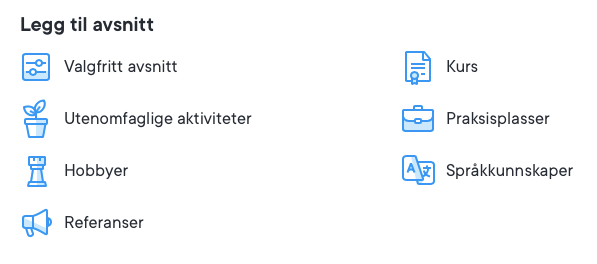 En annen måte å tilpasse CV-en din på er med egendefinerte avsnitt. Du kan selv velge navnet til et egendefinert avsnitt. For å legge til et egendefinert avsnitt må du bla helt til ned i CV-verktøyet, til de ulike alternativene.