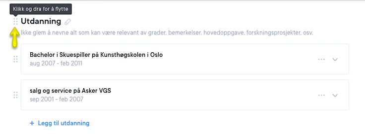 Endre oppsett* – Alle avsnittene under profilteksten i hovedkolonnen kan flyttes på. For å flytte et avsnitt klikker du på ikonet til venstre for avsnittet, som vist nedenfor. Deretter kan du dra avsnittet opp eller ned. Se skjermbildene nedenfor.