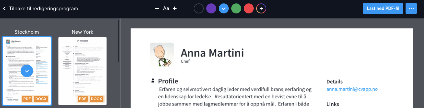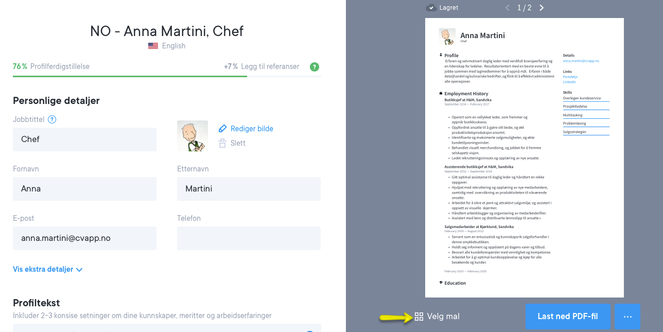 Når du er i forhåndsvisningen av hele siden, kan du også endre malen ved å klikke på "Velg CV-mal" nederst på skjermen. Se skjermbildet nedenfor.