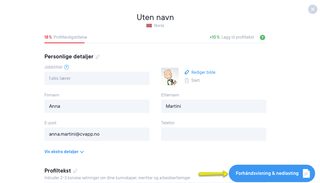 Når du begynner å legge til innhold i din CV, kan du forhåndsvise din CV i malen når som helst på høyre side. Endringene dine gjenspeiles i forhåndsvisningen i sanntid.