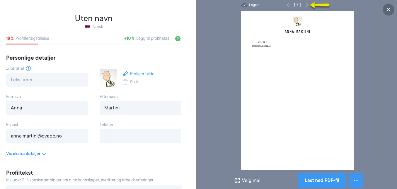 Som standard lagres alt du skriver i CV- eller følgebrevverktøyet med en gang. Du trenger ikke å klikke på lagre for å lagre innholdet. Verktøyene har fått en ny funksjon som sikrer at tekstinnholdet lagres, selv om du mister nettforbindelsen. Når forbindelsen gjenopprettes vil verktøyet synkronisere innholdet med serveren.Når du forhåndsviser CV-en din eller følgebrevet ditt, ser du øverst på skjermen piler som du kan bruke for å bla i dokumentet. Se skjermbildet nedenfor.