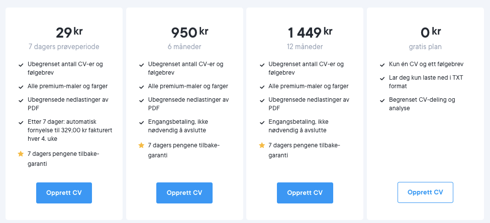 Hvis du nedgraderer til en gratisplan, kan du alltid logge inn på cvapp.no og få tilgang til og redigere CV-en din og følgebrevet ditt gratis, samt oppgradere til en premium-plan når som helst.